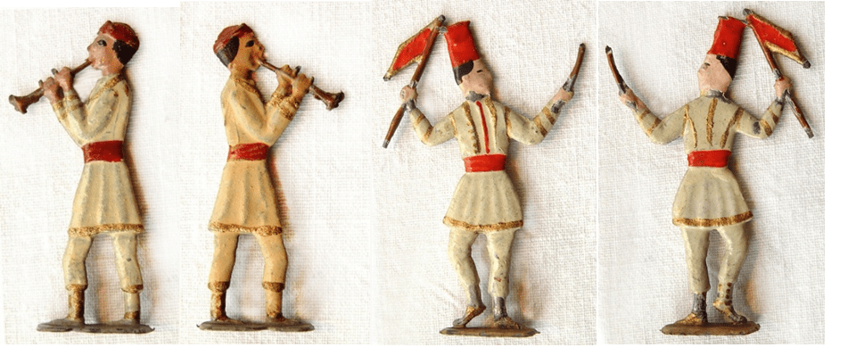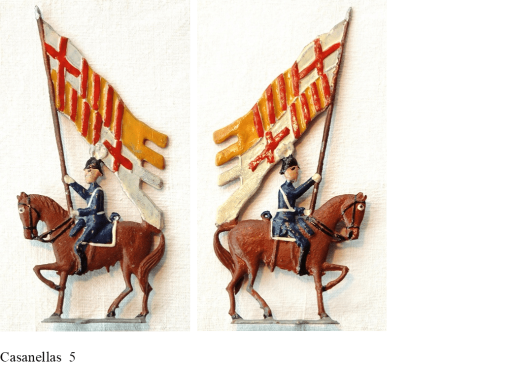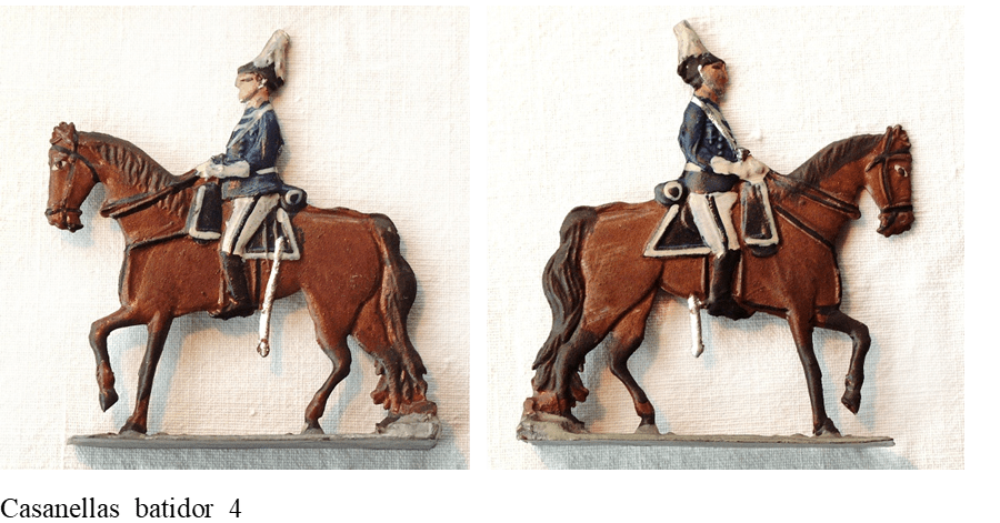 3 y 4.Guardias municipales montados. Casanellas tiene dos modelos fabricados posiblemente antes de la Semana Trágica con la intención de mejorar la caballería de Lleonart, que se doblegaba a menudo por las patas de los caballos. Uno toca la trompeta sobre un caballo blanco, el otro es un oficial sobre un caballo marrón. La proporción es la misma que la de los caballos de Lleonart, la altura del trompeta es de 68 mm. pero la pieza es más gruesa, pasa de 2 a 3 mm. y la peana es más sólida.