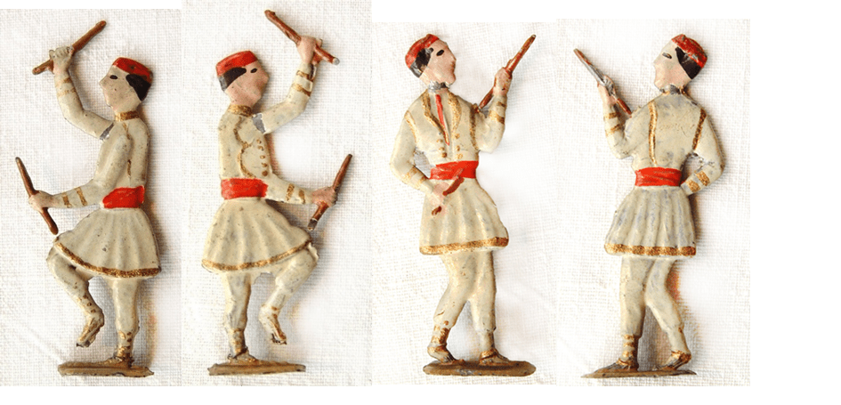 En el impreso leemos » Fábrica de Juguetes de Estaño y Plomo» y vemos que eligió Baldomero Casanellas como imagen de empresa la diosa romana Minerva, protectora de las artes y las ciencias. Los dibujos del impreso nos muestran tres tipos de figuras muy diferentes, en primer lugar dos alabarderos, que por su proporción respecto las otras que se representan, deducimos pertenecen al tamaño Extra o de 54 mm. Ambos alabarderos llevan una alabarda, el de la izquierda está en posición de firmes y con la alabarda derecha, mientras que la posición del de la derecha es «al paso» y con la albarda recostada en el hombro. El centro lo ocupa una plaza de toros con diferentes figuras: el picador a caballo frente a un toro embistiendo, un torero con la espada y el toro parado y un torero citando con la capa. A la derecha una escena bélica en la ladera de una montaña, en la cima una fortaleza con la bandera española y entre los soldados el abanderado, los que corren con el fusil y un oficial a caballo. Mostramos en la foto que sigue los modelos que conservamos correspondientes a dicho dibujo: