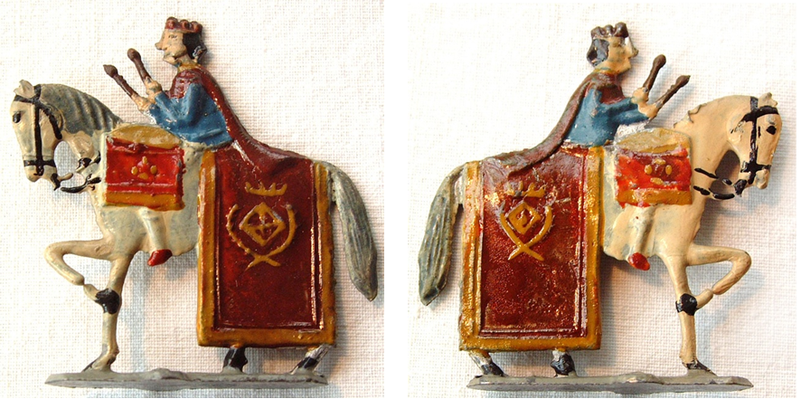 Como vemos a continuación hay dos figuras muy semejantes. La de la izquierda no tiene gravado ningún nombre, desconocemos el fabricante. La de la derecha es de Alca-Capell. La figura de la izquierda debió fabricarse, igual que la otra, con una perforación en la mano levantada para poder introducir el fusil,como veremos en nuestro molde. La de la izquierda lleva dos perforaciones en los pies, lo que hace suponer que debía sustentarse sobre una peana, ya que sola no se mantiene derecha, véase el alfiler que hemos puesto detrás para tenerla en pie. La de la derecha se mantiene perfectamente sola.