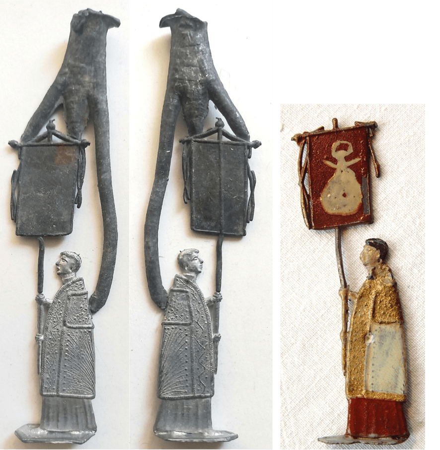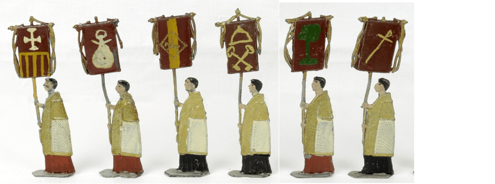 22 y 23. Sacerdotes con capa pluvial y miembros de las cofradías portadores de gonfalones. Casanellas hace un molde nuevo para estas figuras, donde el sacerdote con capa pluvial es igual al de Lleonart y el portador de la cofradía o del gremio, con chaqueta y pantalón negro, forma parte de un nuevo repertorio. Vemos de izquierda a derecha el gonfalón de la basílica de la Merced, el de la basílica de Santa María del Mar, la parroquia de Sant Jaume, la de Sant Pere de las Puellas, la basílica de Santa María del Pi y la parroquia de Sant Pau del Camp. Nos podemos hacer una idea de cómo sería el molde, con las dos boquillas de entrada de material, una para cada figura y la distribución de la colada en tres puntos de la figura, uno por la espalda y dos por el gonfanon.