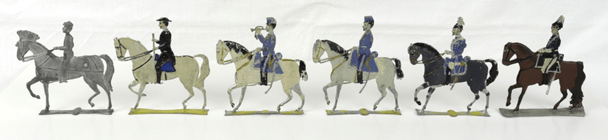 En el complejo proceso que lleva a la figura de plomo final que nosotros apreciamos como obra artística, juguete, pieza de colección y reflejo de una época, en algunas ocasiones conocemos los promotores, los emprendedores, los coleccionistas, los matriceros, pero a menudo el papel del artista pasa totalmente desapercibido. Es seguro que artistas ya con un nombre o bien estudiantes de Bellas Artes o de talleres reconocidos, fueran los artífices de algunos de los muchos modelos que han dado buena fama a la producción española. En el último tercio del s.XIX la formación artística pública tenía en la escuela de la Llotja de Barcelona una afamados profesores, entre ellos los hermanos Vallmitjana, quienes por sus viajes al extranjero, especialmente París, podían conocer bien las figuras de pleno volumen, Agapito Vallmitjana hijo, estaba especializado en su producción en temas de animales. En el caso de las figuritas que pertenecen al Estado Mayor General, cada uno de los caballos está en una posición diferente, sea por las patas, por la inclinación o por el ladeado de la cabeza. La altura total de dichas figuras, caballo con jinete, es de 92 mm. No olvidemos el acabado final, el momento de la pintura, en el que diestras manos y cuidadoso detalle hacen de cada pieza una pequeña obra de arte.