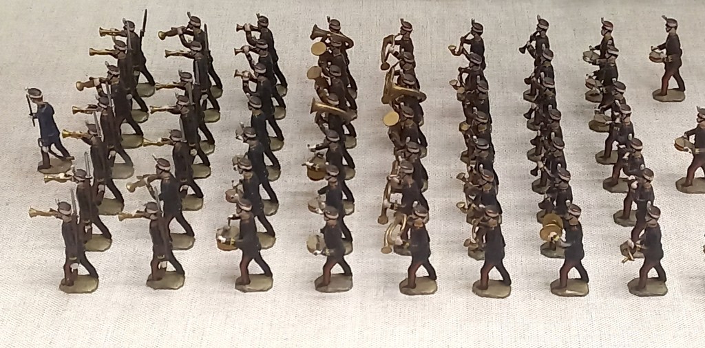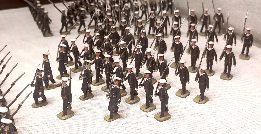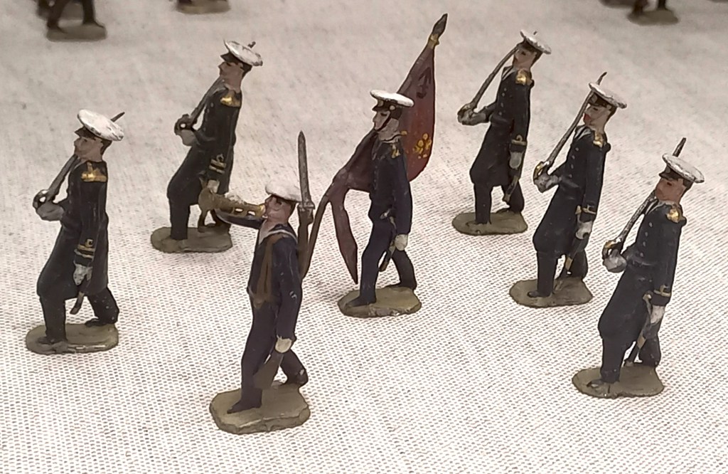 En la ciudad de Barcelona el Museo Marés, al lado de la catedral, en la sección dedicada al juguete, cuenta con tres vitrinas con figuritas de la primera producción barcelonesa del S.XIX y con otras figuras españolas, alemanas e inglesas. Se muestra una formación de la 1rst King’s Dragoon Guard, posiblemente hecha en principio por encargo del coleccionista inglés afincado en Barcelona Leonard Rowe y que podemos situar en la década de los veinte. Podemos ver fotografías de las piezas de esta formación en las entradas de este blog que corresponden a los primeros años de «Sobrino de Baldomero Casanellas». En el Museo, de momento, se hace imposible obtener ninguna información al respecto, puesto que carecen las vitrinas de esta sección de ningún tipo de rótulo o indicación para, además de gozar de la belleza de las piezas y su magistral exposición, alguna idea respecto quienes las fabricaron, cuando, donde y con que objetivos, información que nos parece básica entre los objetivos de un museo, el didáctico. La formación inglesa de Casanellas-Capell está en la vitrina entrando a la izquierda, rodeada de figuras del fabricante inglés Britains, una de cuyas formaciones recrea la coronación de Jorge VI en 1936.